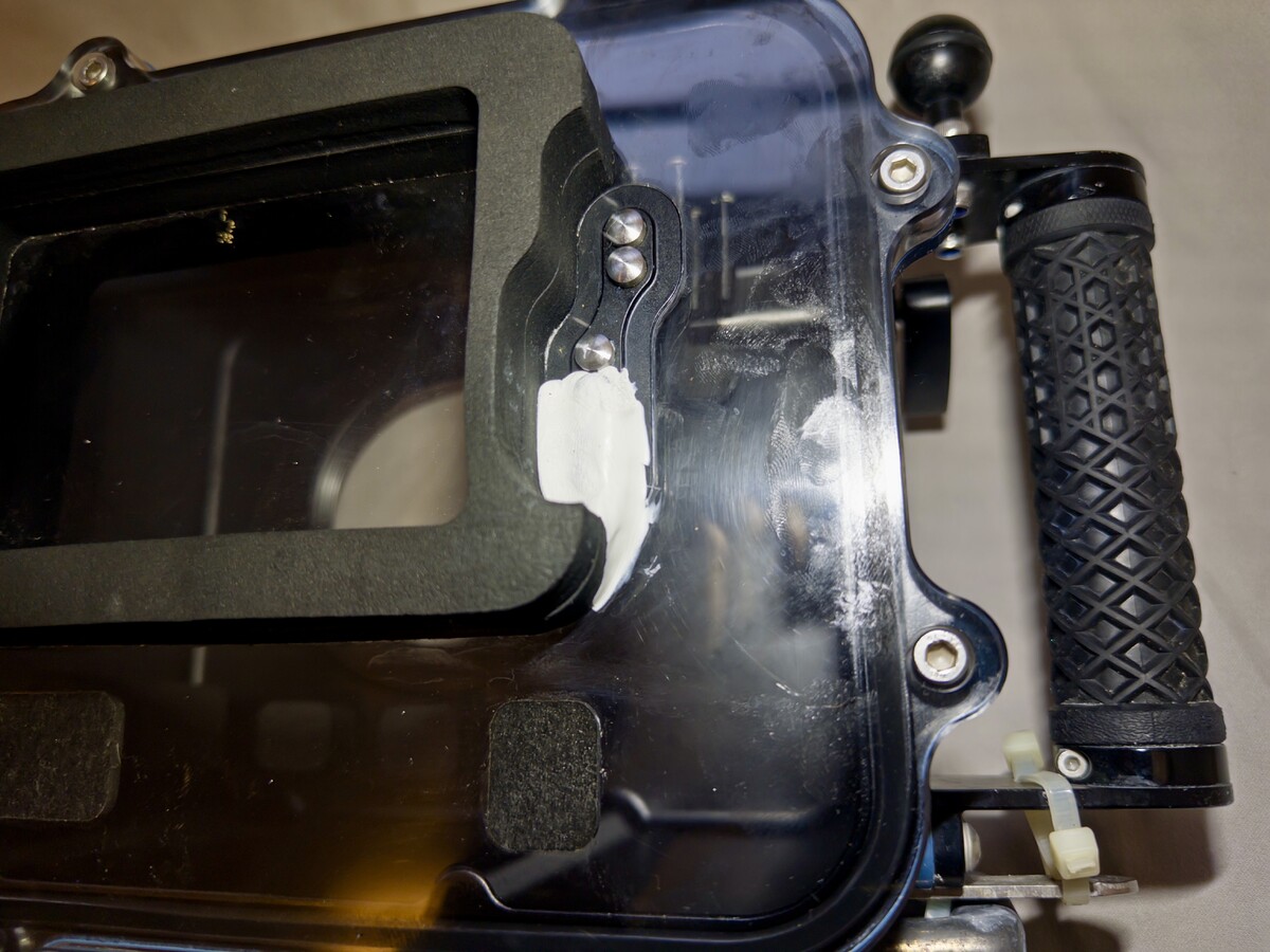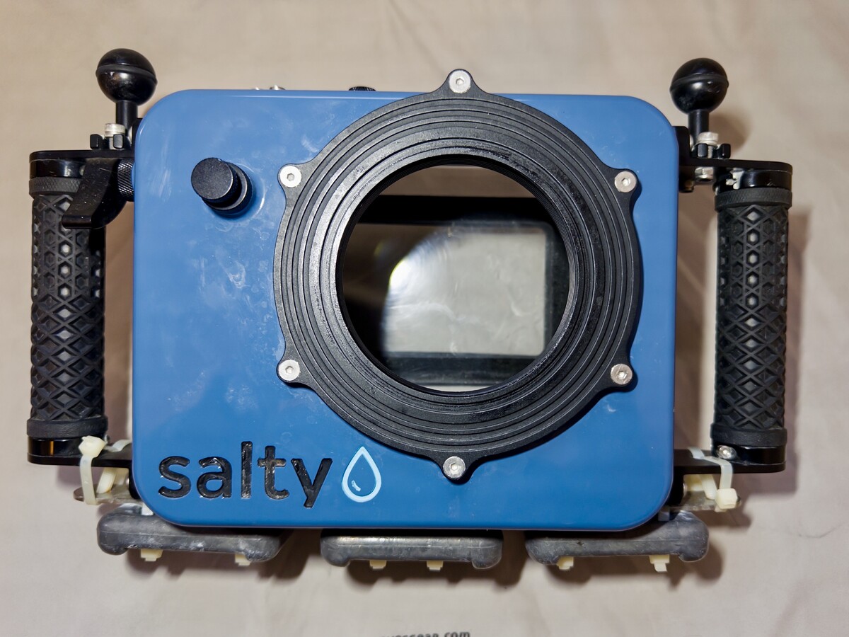 Hint for the acrylic backplate: During the last dives, some drops of water entered through the side buttons. I used Sika-Flex to watertight these buttons again. Therefore, they lost their function, but I hardly used them before, as they are only to control playback, display zoom, and the menu (but due to touch control, even before, it was not possible to change the menu). The whole backplate is available as a replacement part at Salty Surf if needed.
