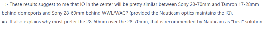 For the original poster, Alex I have used both the Sony 28-60 and 28-70 kit lenses with WACP-1 (native N120) and both also work with WACP-1B (native N100). The 28-70 uses an additional 20mm of extension, does not focus as fast as FE 26-60 and if you look at many land reviews the 28-60 out performs the 28-70. In real world use with water contact lenses you won't see large differences between the two lenses in terms of IQ. I don't think it's a big mystery that a kit lens introduced by Sony in 2021 would have improved over a Sony kit lens introduced in 2013. By the introduction of the WACP-C I had sold the 28-70 so can only comment on WACP-1, however I would expect results to be about the same. Since I rarely used the 70 or 60mm end of the lenses I don't miss the difference. Any comments from wet pixel you may have seen would I believe reference overall performance not just IQ. I have found best results with both lenses to be in the F/8 to F/11 range even though with full frame my normal starting point is F/13+/- I reviewed the WACP-C and both the WWL-1 and WWL-1B in past issues of UWPMAG.com. As a sidebar the first Nauticam wet wide lens I tested was the WWL-1 and I used the Sony 28mm F/2 lens for that review because 28-60mm was not yet released. Nauticam still offers an N100 32 flat port for that lens but it is not shown on the port charts for use with WWL-1/1B. Last what is hardly ever talked about when involved in a wet wide lens discussion regardless of brand is Depth Of Field. While many of these lenses advertise a 130 degree diagonal AOV it has become clear to me and many others who have used these lenses extensively that DOF is far less than what you get with a lens of the same 130 degree AOV behind a dome port. This became blatantly obvious to me when I tested the Laowa 10mm F/2.8 a 130 degree rectilinear lens against images taken with wet lenses of the same130 AOV.
