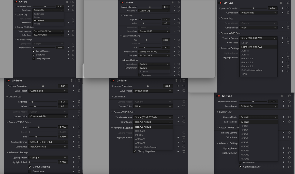 Regarding the GP-TUNE plugin its very easy to use, but its important to read the Manual and their tutorial to make sure you get the correct profile settings in davinci. https://xtremestuff.net/gp-tune-plugin-manual/