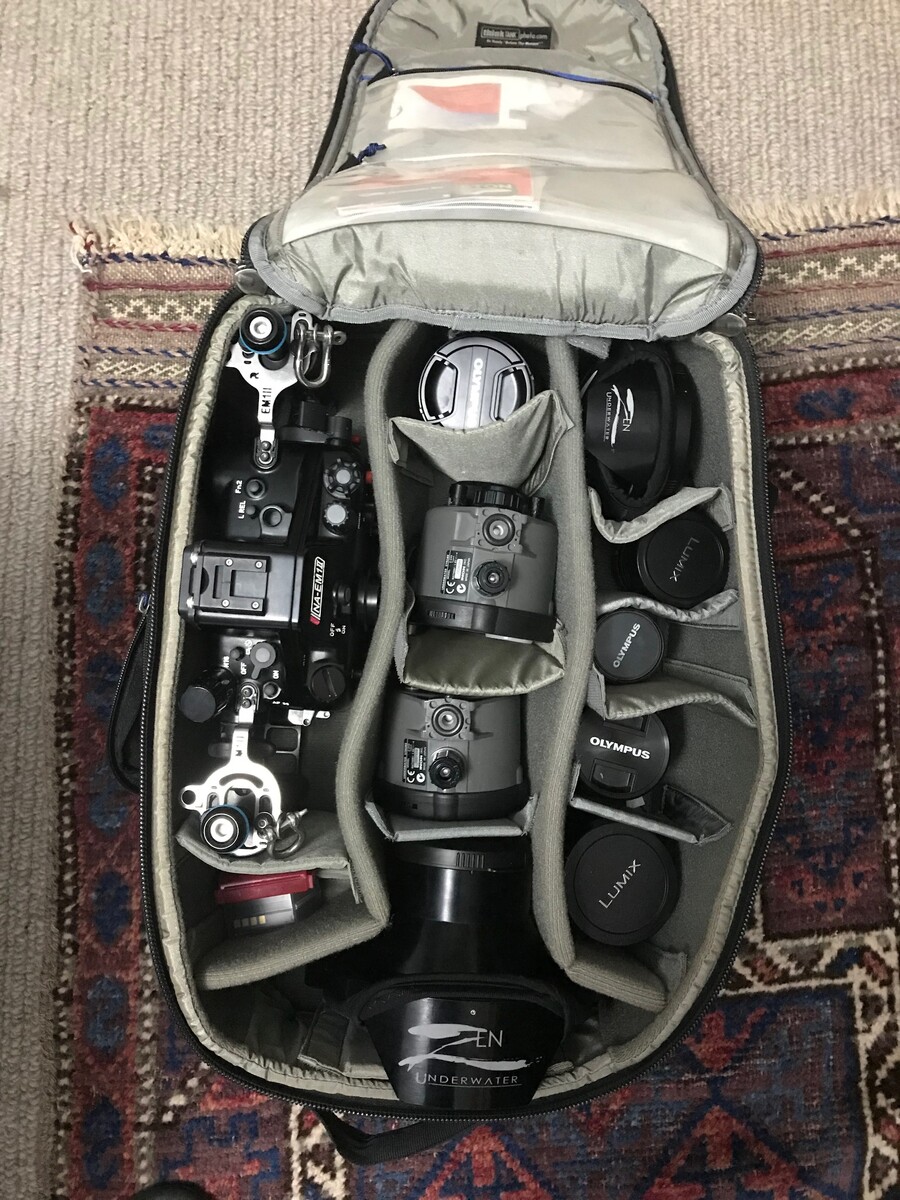 I find Lowerpro bags to be excessively heavy - my Think Tank AirPort Express (or Airport something-or-the-other, anyway) backpack is a little over 1kg, and also square, which makes it more space efficient than the rounded Lowepro bags. Like you, my carryon is around 14kg when I travel with my Marelux kit, so I avoid rollers (which add more weight). It's a bit of a pain in the ass when boarding/deboarding but it isn't the end of the world and all that gym time finally has a practical payoff too. :) @Apneagraph you should be able to fit all that kit into a much smaller bag with care. Even something like a ThinkTank shoulder bag, actually. Or consider getting an Osprey backpack and putting a camera insert in there for the stuff that needs protection. That will be lighter and also easier to carry. I'll share some photos of my travel setup for my Nauticam M4/3 shortly, as well.