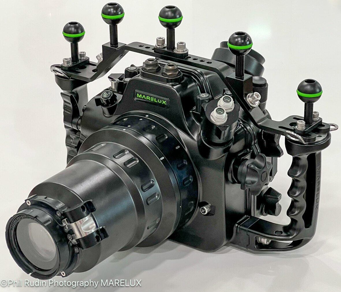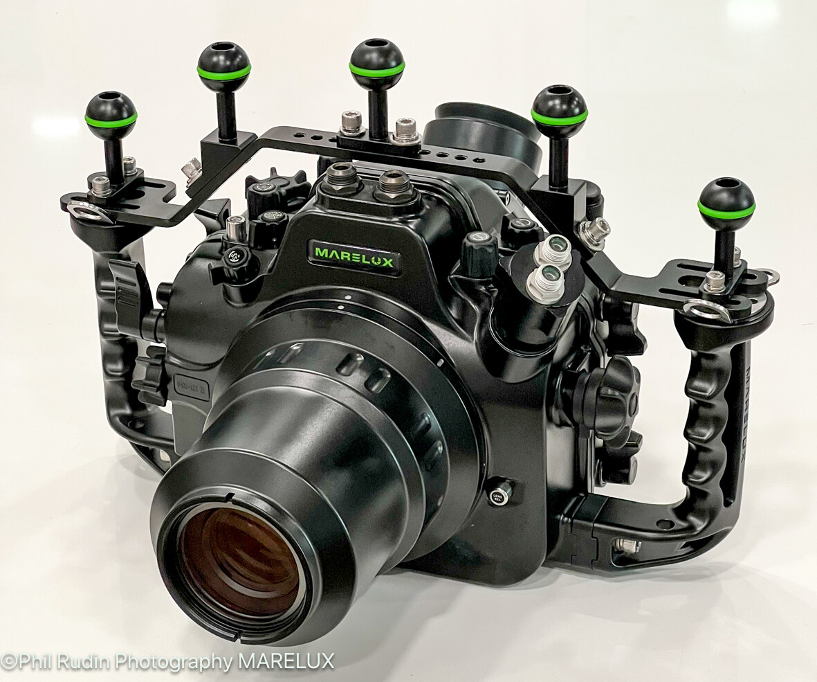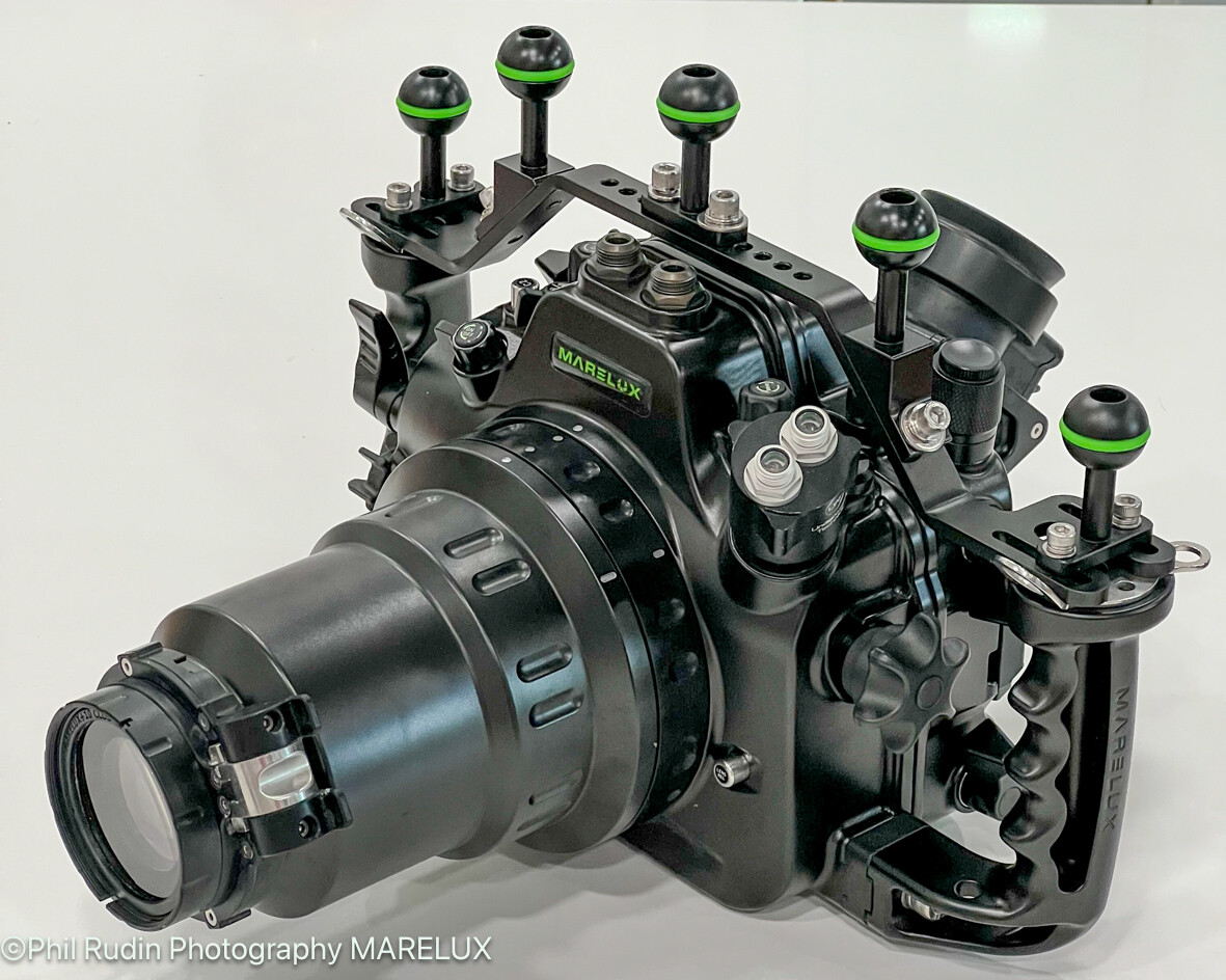 Photos of the Marelux MX-A1II housing with the new 112 macro port for the Sony 100 macro. First image with the port and no extensions. With the 1.4X teleconverter the 15mm extension is just a mm or two short, second photo is with the 1.4X tele and 20mm extension and the third is with the 2X tele converter using a 30mm extension. Ports with extensions have the Marelux MV +10 C/U lens in place. The C/U lens does not seem to slow the AF but I need in water tests to evaluate.