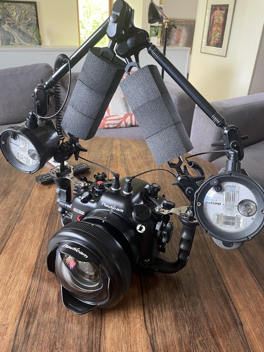 Nauticam housing, EM-1ii camera body, one lens with port, three flashes