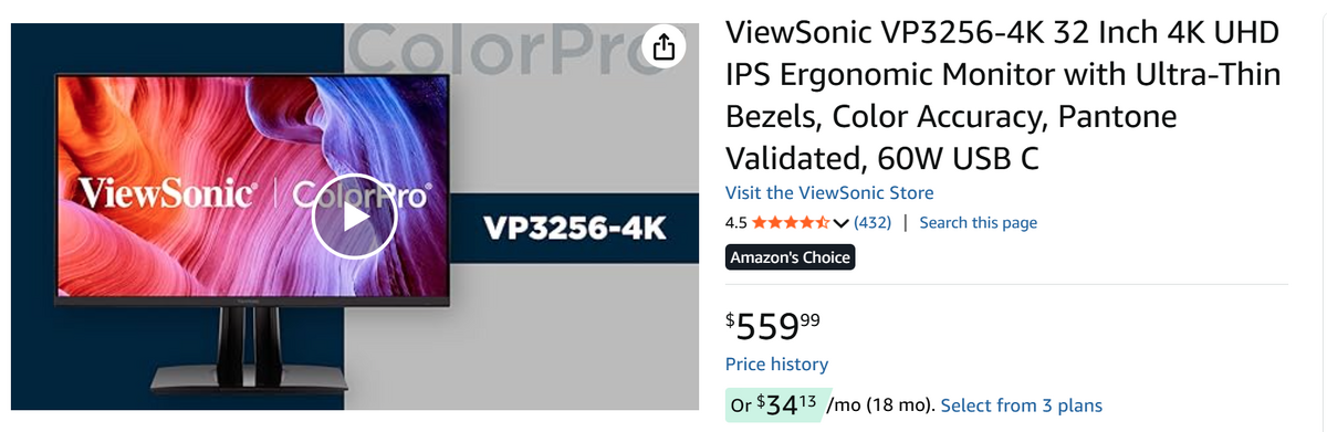 I've been using an older version of this Viewsonic 32" 4K monitor for years and it's been fantastic. It is moderately priced at under $600usd. It's 100% sRGB which is more than adequate for my needs, and probably most non-professional users. It was over $700 when I bought it 6 or 7 years ago, so this seems like a great deal.
