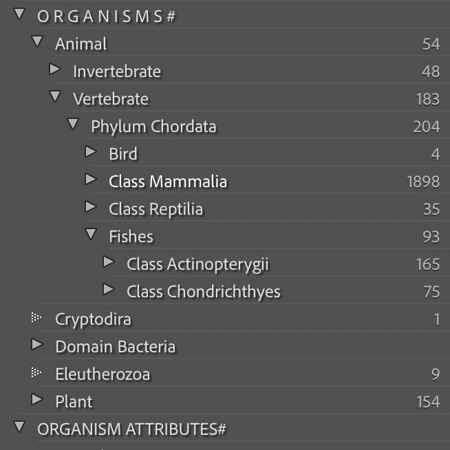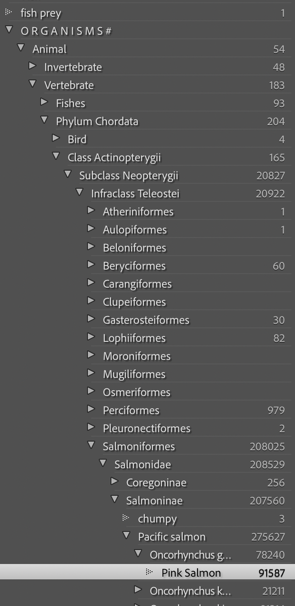 A hierarchy is useful for doing the whole taxonomic nine yards. Here is an example from my LR catalog. I only have to type in pi, the first two letters in pink, and LR often gives me pink salmon as the first choice. Select that and all the higher bits are automatically added on LR export such as when generating jpegs. Note that I have over 91K pix of just that species but the number above is smaller. It is possible to equalize the numbers but it is time consuming so I have not done it for a while. As well you will note the mixture of English and scientific names. This is so the English names for higher taxonomic groups also get included in the key-wording. The includes some rather obvious words like vertebrate. I have been using LR since version 1.0 so this is a fairly developed KW list. It is VERY easy to modify. Just drag the keyword around in the list. Put it under the KW you want in the hierarchy. I have done a LOT of modification over the years. This includes having to deal with taxonomic revision such as for the mantas a few years ago. Often have to fix spelling errors! Need to do some clean up as well - the fish prey KW needs to be moved or deleted. I use the # symbol as well as all caps to designate a division in the KW list just to keep them more organized. It can selected (via a dialog box) so that this not exported hence it is a non-keyword.