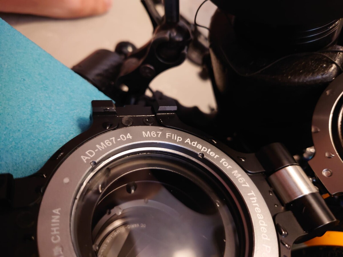Basically the CMC-1 and CMC-2 comes with a 67mm adapter (Nauticam), to use it directly on any 67mm port - you remove it to use the lens on a flip mount - this adapter doesn't fit on the AOI flip adapter (it's too big, so the adapter's locking mechanism gets in the way (it hits the adapter's dented thing), and you can't screw it on the flip. Meaning you can only use the diopter without it (which is normal, this is the way you're supposed to mount it on the Nauticam flips), However, without it, the CMC1's lens end extends to far from the flip holder, as seen in the picture, meaning you can't close the flip and there is a gap. The solutions is not to screw it in fully, or rather to put an o-ring on the tread so you can screw it in but it doesn't extend as much, then you can close the flip and not have a gap.