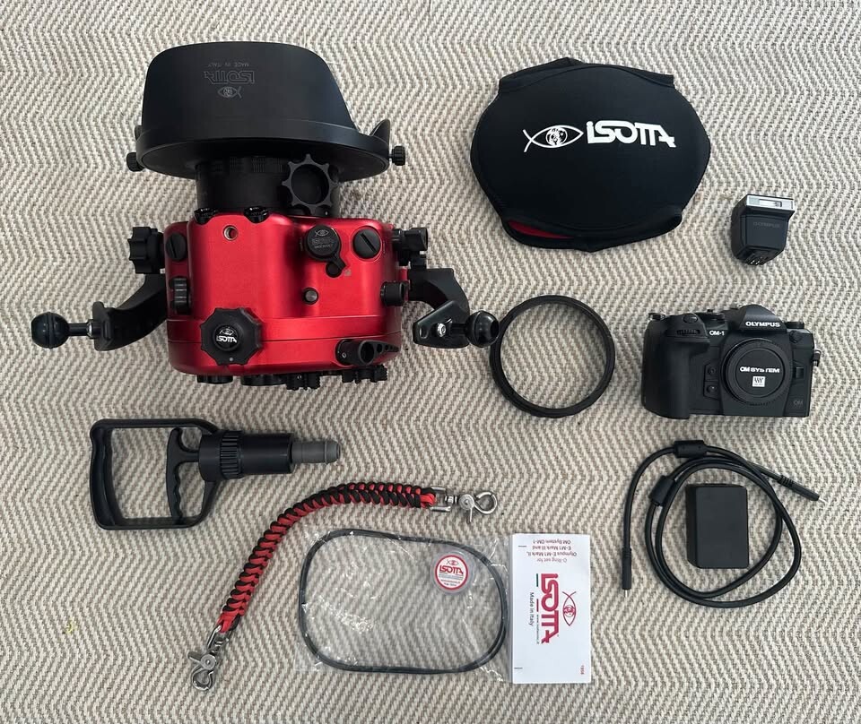 I have for sale a very well looked after Isotta OM-1 set. I have taken it on about 65 dives, and it has always been soaked in fresh water very well after every dive. No water has ever entered the housing. All buttons, dials, and levers work very smoothly. The dome glass is flawless. The set includes the following: - Isotta OM-1 housing - 6.5" glass dome port - 15mm extension ring (for use with Olympus 8mm fisheye) - 40mm extension ring (perfect for panasonic-leica 8-18mm and olympus 12-40mm f2.8) - OM-1 body (low shutter count) - OM-1 battery, charger, flash - Vacuum system (installed) and pump - Lanyard - Spare o-ring set for the housing I purchased this set in January 2024 for a combined total of $6,300. Asking $4,300 and I will include worldwide insured shipping. I am open to selling parts of this set as well, depending on what it is. I've been very happy with this setup, the OM-1 is an amazing camera and the housing is a joy to use. The reason I'm selling is that I'm switching systems due to changing needs. I'm located in Adelaide (Australia) but I'm happy to ship it anywhere in the world. I will be in the US at the end of June so I can also bring it and ship from there as well.