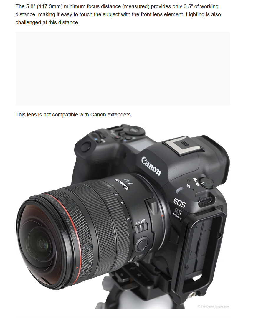 The 7-14 Fisheye is unfortunately NOT compatible with RF Extenders: https://www.the-digital-picture.com/Reviews/Canon-RF-7-14mm-F2-8-3-5-L-Fisheye-STM-Lens.aspxwaso started following Focus light necessary for macro? , Hybrid Flash Snoot Review , Flip holder or Bayonet system? Nauticam - Macro wet lenses and 1 other- Must Watch Video: Dome Port Theory Explained