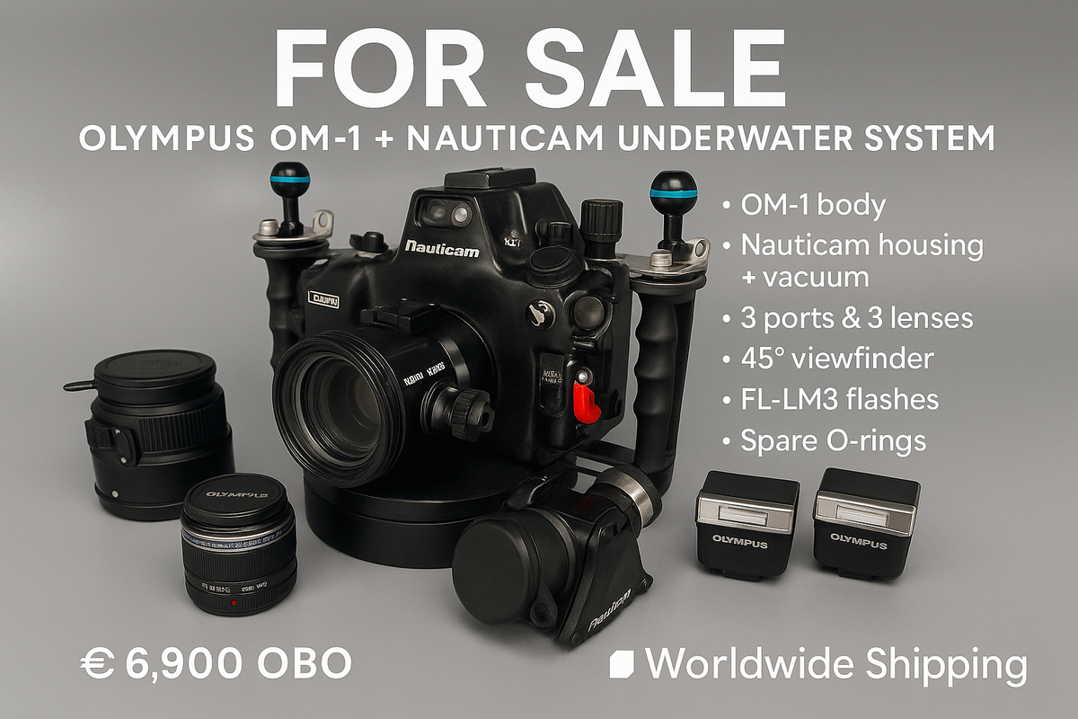 I’m selling my Olympus OM-1 underwater setup as I’ve recently moved to a new camera system and don’t need two bodies. This rig has been my main workhorse for the last few years, and nearly all images on my account were taken with it: 👉 instagram.com/aliensfromthedeep Camera condition & usage: • Purchased 2022 • Shutter count ~25,100 (well below the OM-1’s rated mechanical life of 400,000 actuations) • Always handled carefully and primarily used underwater • All functions working perfectly Why this system is great underwater: • Compact pro-level setup — significantly smaller than full-frame housings, easier to travel with • Extremely fast — up to 120 fps for fast-moving marine life • Excellent AF & low-light performance — ideal for night, blackwater, or available-light shooting • Strong IBIS stabilization • 12–50mm “macro-mode” lens — can be switched into macro underwater (approx. 43mm macro / ~86mm FF equivalent). Paired with a wet wide-angle lens (e.g. Nauticam WWL-C) you can shoot wide-angle and macro on the same dive. • Nauticam vacuum leak detection system included — essential peace of mind underwater Included in the sale: • Olympus OM-1 body • Nauticam NA-OM1 housing • Nauticam vacuum system (installed) • Nauticam mirrorless 45º viewfinder • Zuiko 60mm macro lens • Zuiko 30mm macro lens • Zuiko 12–50mm lens • Nauticam port for 12–50mm (with zoom gear) • Nauticam port for 60mm • Nauticam port for 30mm • Two Olympus FL-LM3 flashes (one in use, one as backup) for fibre-optic strobe triggering • Spare O-rings for the Nauticam housing, all ports, and the viewfinder • 3 batteries (2 are third-party) • External dual battery charger Condition / full disclosure: • The system shows normal signs of use from regular diving. • The Nauticam housing has some of the typical “dusty” cosmetic discoloration that many aluminum housings develop over time. • After every trip, the housing and ports were soaked and cleaned in distilled water to prevent salt deposits. • The rubber wheel that controls the mode dial inside the housing should be replaced. I’m happy to have this done before shipping. • For the 12–50mm zoom gear to fit correctly, a small section of metal on the zoom gear was filed down. Purely cosmetic — has worked perfectly for years without issue. The system has been absolutely reliable and has never flooded. The vacuum system and spare O-rings add an extra layer of safety underwater. I’m happy to help the buyer set it up, walk through the controls, and share tips for getting the most out of it. I can also provide detailed close-up photos of lenses, ports, zoom gear, or any other component on request. Location: Berlin, Germany Shipping: Worldwide, insured to full value, professionally packed • Shipping costs can be shared with the buyer • Item will be shipped only once payment has cleared • Personal hand-over in Berlin is very welcome Payment: Bank transfer or PayPal (buyer covers fees) Price: €6,900 OBO (or best reasonable offer) Feel free to contact me for more photos, detail shots, questions, or more sample images taken with this system.