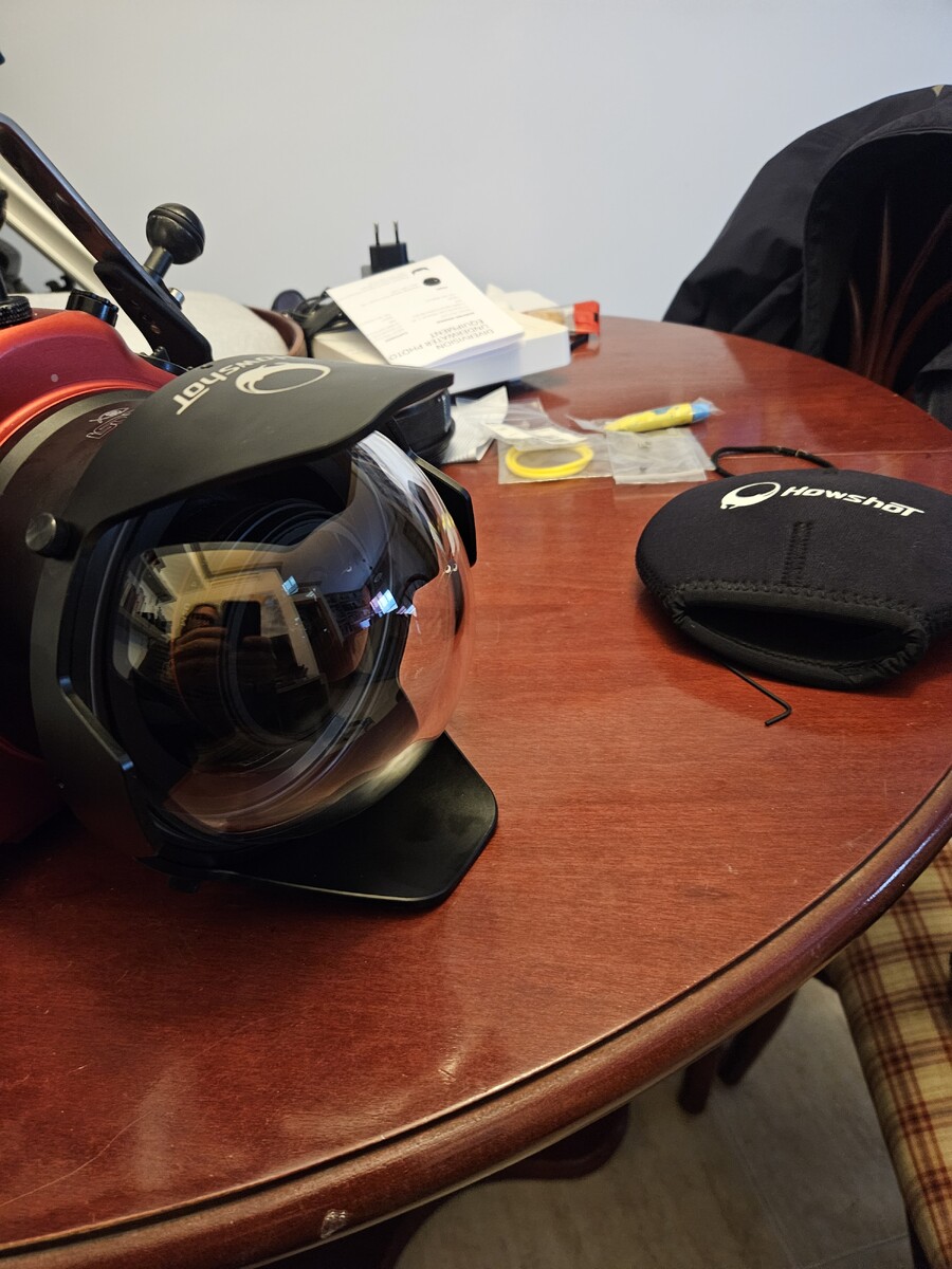 And a little more of info. My HowShot 140 mm glass dome has arrived one week after buying. One week from Taiwan to Spain, not bad at all. I bought it with an extra neoprene cover, so the value for customs was 765 US$. They marked in the customs declaration as a gift, so I paid 10 euros in tariffs. Not a big deal when I was expecting about 200 euros in tariffs. That said, the dome port has nothing to envy Nauticam for, the quality looks fantastic and the lug can be unscrewed, so you can screw the Nauticam lug. Also the shade comes with small allen screws which you can remove and screw for another ones with a plastic grip in order to remove the shade easily. I can't wait to test in the water, but the weather is terrible right now.